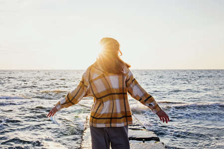 Seascape at sunrise with beautiful sky. Woman on the beach during sunrise. Young happy woman with hands in the air stands on the beach and gazes at sunrise