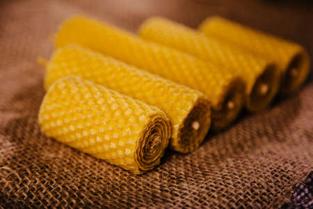 Yellow beeswax candle. A beautiful eco souvenir made from natural products. On sackcloth