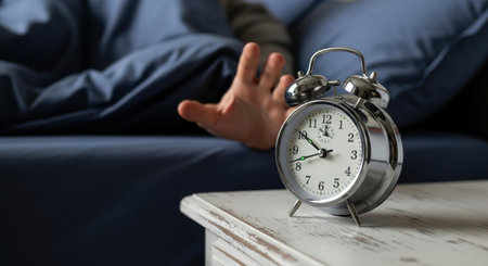 A hand reaches out from under a blue duvet to silence a classic silver alarm clock ringing loudly on a white nightstand in a bedroom.