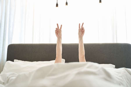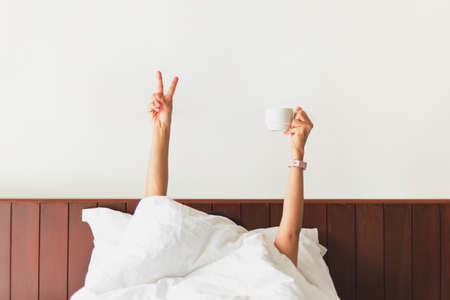 good morning concept - female or male hands with coffee mug and victory sign sticking out from the blanket, copy space over white wall background