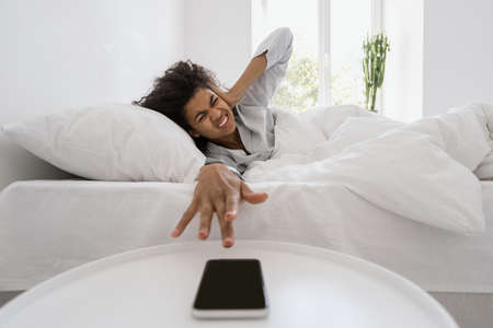 Selective focus on dissatisfied, irritated african american woman waking up and turns off alarm on smartphone. Annoyed female lying on bed in nightwear, reach hand and mute clock on phone at morning