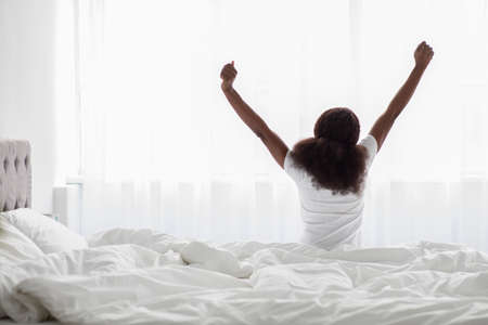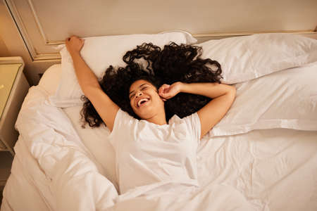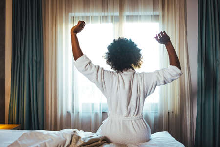 A relaxed African American woman with curly hair is stretching in bed with light grey sheets, smiling gently as she wakes up. Bedroom interior.