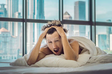 Man wakes up in the morning in an apartment in the downtown area with a view of the skyscrapers. Life in the noise of the big city concept. Not enough sleep.