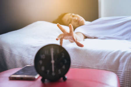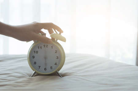 woman hand turn off or snoozing alarm clock waking up on morning in bedroom with sun light.