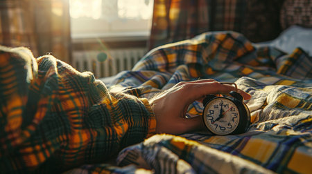 Person Holds an Alarm Clock in Bed with a Plaid Blanket with Natural Light Shining Through Window