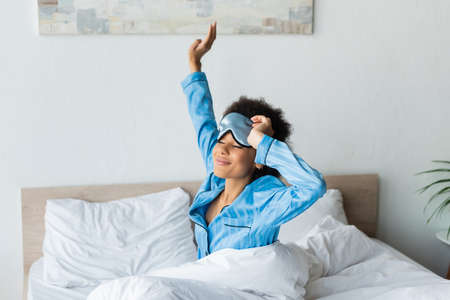 sleepy african american woman in pajamas adjusting sleeping mask and stretching while smiling in bedroom