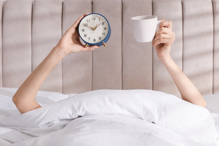 Woman with alarm clock and cup in bed at home, closeup. Good morning