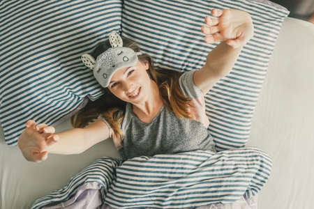 A young woman in mask for sleep stretches as she wakes up from a good nights sleep. Waking up, top view.