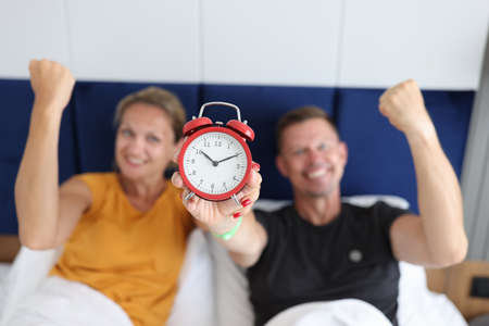 Closeup alarm clock having a good day with background happy woman stretching in bed after waking up, sunlight in morning.