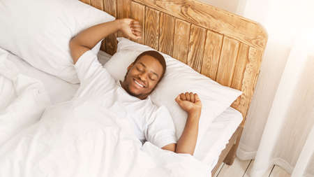 Wellslept African American Man Waking Up Stretching Hands Lying In Bed Smiling With Eyes Closed At Home. Awakening After Good Sleep In The Morning, Rest And Recreation Concept. High-Angle, Panorama