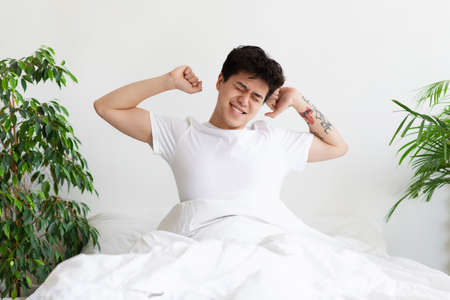 Start your day refreshed a handsome man stretches in bed, arms raised, yawning with ease