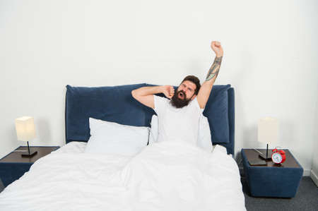 Sleepy early morning. Bearded with sleepy look in morning. Sleepy hipster stretch and yawn in bed. Wokeup sleepy. Awakening. Bedtime routine. Nap time. Feeling as though he got no sleep at all
