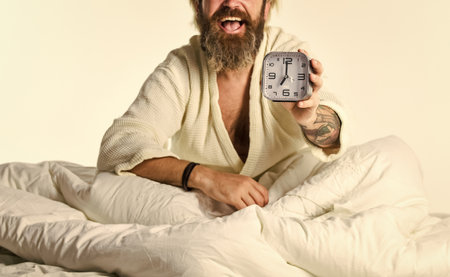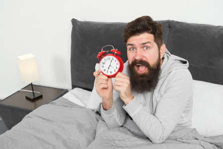 Get up right now. What time is it. Stressed man alarm clock. Sleepy man holding alarm clock in bed. Bearded man with alarm clock. Hipster want to sleep. Hate early morning awakening. Daily stress