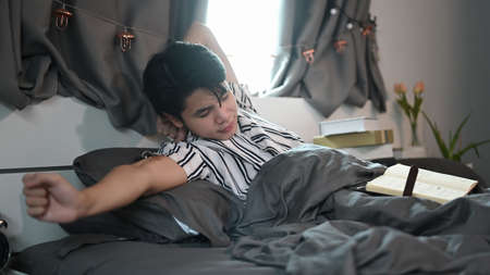 Sleepy man lying on bed and reaching to turn off alarm clock switch in the morning.