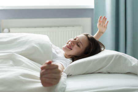 Beautiful smiling young woman waking up stretching in white bed in her room
