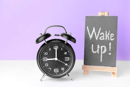 Alarm clock and banner with handwritten phrase good morning on wooden table. Time management concept.