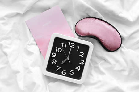 Alarm clock, book, cup of coffee and accessories on white bedding sheets with copy space. Morning lifestyle concept.