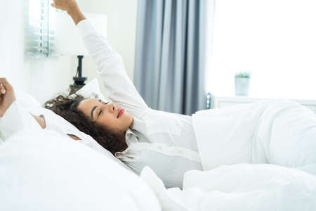 Portrait of young Asian woman stretching in bed after wake up in the morning