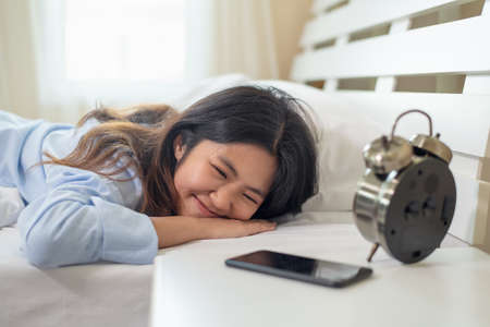 Lazy Asian young woman trying to snooze awaking digital alarm clock on the table beside the bed close up, woman wake up late in morning up to 8.00 am. Tried woman sleeping on the bed in bedroom.