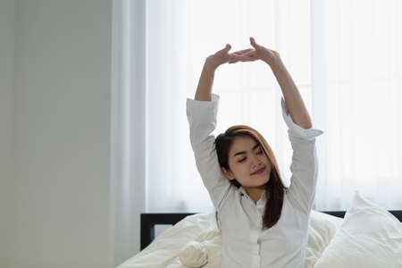 Asian young woman stretching on bed after waking up in morning at her bedroom.