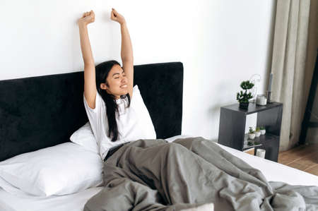 Healthy asian brunette happy girl in a white t-shirt, is awakening with smile and stretching arms after well sleep sitting in a cozy bed, starts her day with great mood, having a good nights sleep