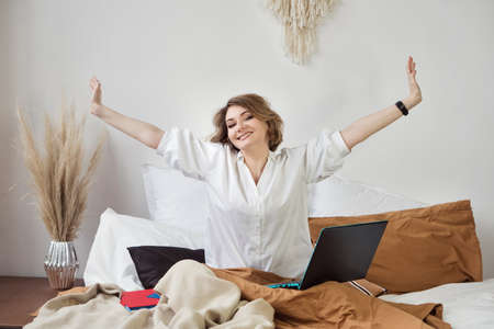 Joyful Woman In White Blouse Sitting At Comfortable Bed In Cosy Home Interior And Working Remotely On Laptop Computer. Work From Home Freelance Lifestyle Concept. Wake Up Early.