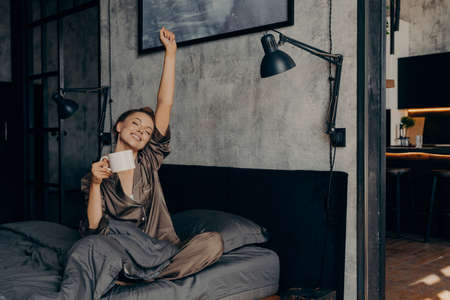 Young beautiful woman with closed eyes and hair tied up in bun starting morning with cup of hot coffee, stretching in bed at home while sitting in satin pajama after waking up from night sleep