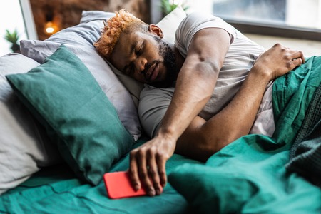 Early morning. Good looking sleepy man taking his smartphone while checking the time