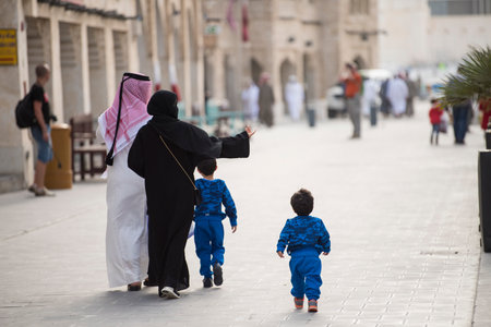 Doha,Qatar - March 05, 2019 : The Qatari family in traditional attire hang out in old bazaar market Souk Waqif.