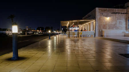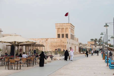 Al Wakrah ,Qatar -02/01/2020 : New souk waterfront promenade with his traditional houses and local people enjoying walking