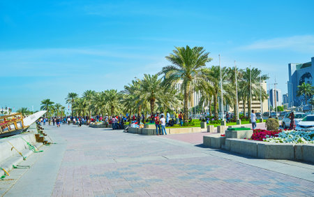 DOHA, QATAR - FEBRUARY 13, 2018: Numerous migrant workers like to spend their day off in Corniche promenade, men have picnics, relax in shade or take a boat trips, on February 13 in Doha