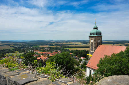 View of the church of Stolpen and surrounding fields in Saxon Switzerland