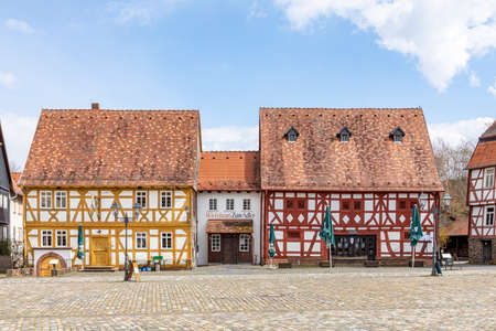 Neu Anspach, Germany - April 15, 2021: market place at Hessenpark in Neu Anspach. Since 1974, more than 100 endangered buildings have been re-erected at the Hessenpark Open-Air Museum.