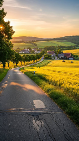 Sky showing winding asphalt road curves through a picturesque rural landscape with golden fields of crops, scattered houses, and rolling hills under a warm sunset...