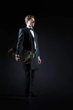 Handsome man in tuxedo. Elegant fashion man classic musician with french horn musical instrument. Full length portrait of classical music player