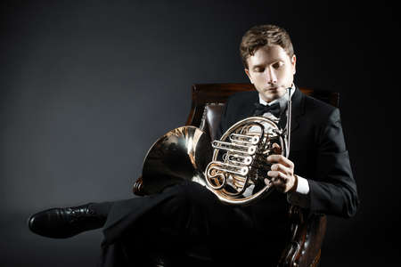 French horn player Classical musician man playing horn music instrument