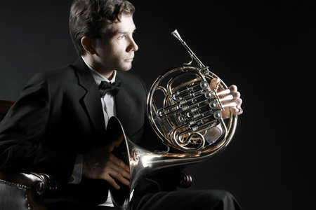 French horn player. Portrait of classical musician hornist with music instrument horn