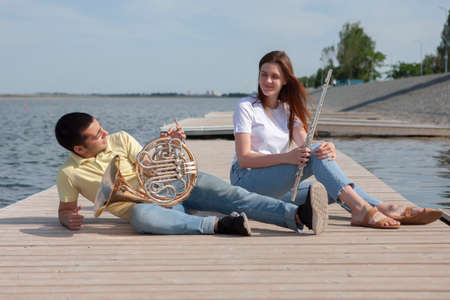 The guy playing the horn and the girl playing the flute on the lake Portrait