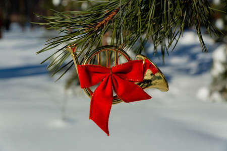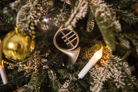 Christmas pendant toy bugle hangs on a Christmas tree branch.