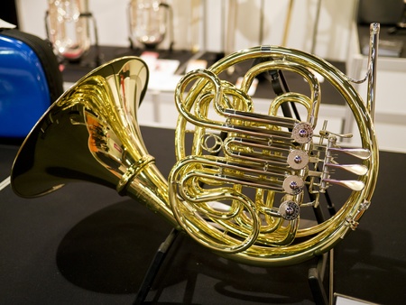 Shiny french horn close up no people interior design detail