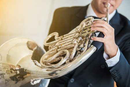 French horn player. Classical musician playing horn instrument