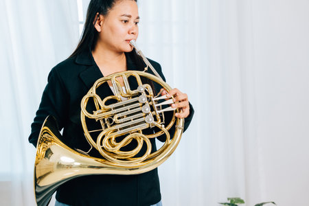 Wearing a black jacket, a female musician plays a golden French horn. The shiny instrument stands out, emphasizing the elegance of her musical performance.