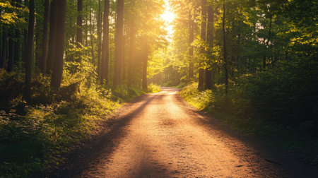 With showing sunlight filtering through tall trees onto a winding dirt path in a lush green forest with dappled light and shadows creating a serene...