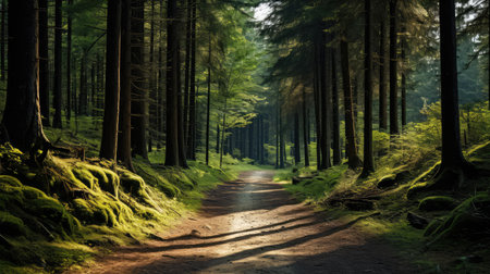 A path winds through a verdant forest, surrounded by tall trees and vibrant foliage. Sunlight filters through the canopy, creating a play of light and shadow. The composition focuses on the natural environment, likely suitable for illustrating themes of nature, travel, or environmental conservation, and various commercial purposes.