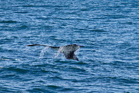 Young humpback whale diving and showing its tail fin in nelson mandela bay south africa