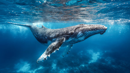 Humpback Whale Plays Near the Surface in Blue Water. Generative AI. High quality illustration