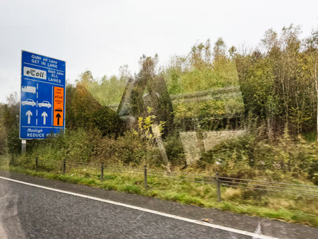 Dublin, Ireland - October 21, 2025: Blue Ireland traffic sign directs vehicles in lanes beside a green woodland landscape.