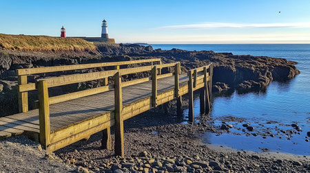 A picturesque wooden pier extends toward two lighthouses along a tranquil coast, offering a serene view of the calm ocean waters and rocky shore.