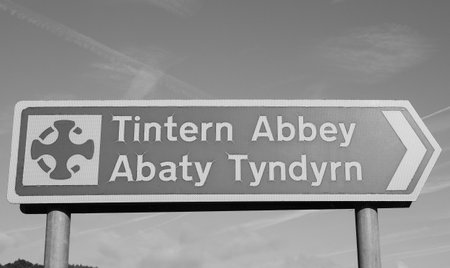 TINTERN, UK - CIRCA SEPTEMBER 2019: Tintern Abbey (Abaty Tyndyrn in Welsh) sign in black and white