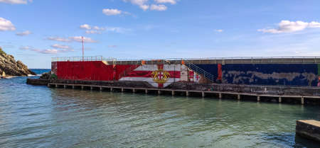 GENOA, ITALY, APRIL 09, 2021 - View of Genova Nervi pier painted with Genoa team football club colors, Genoa, Italy.
